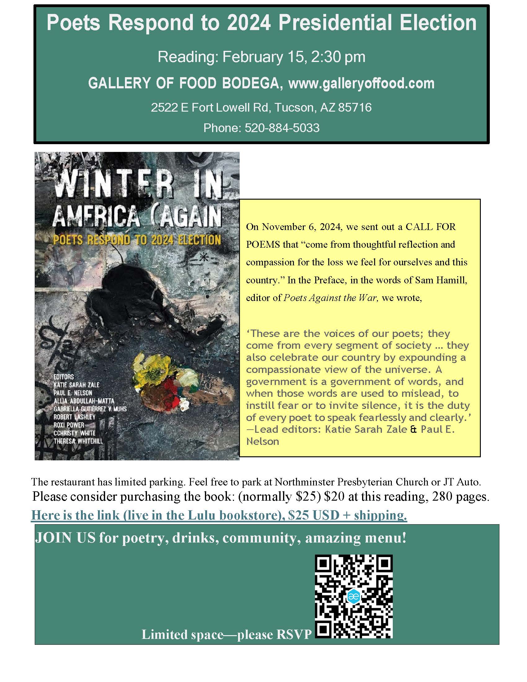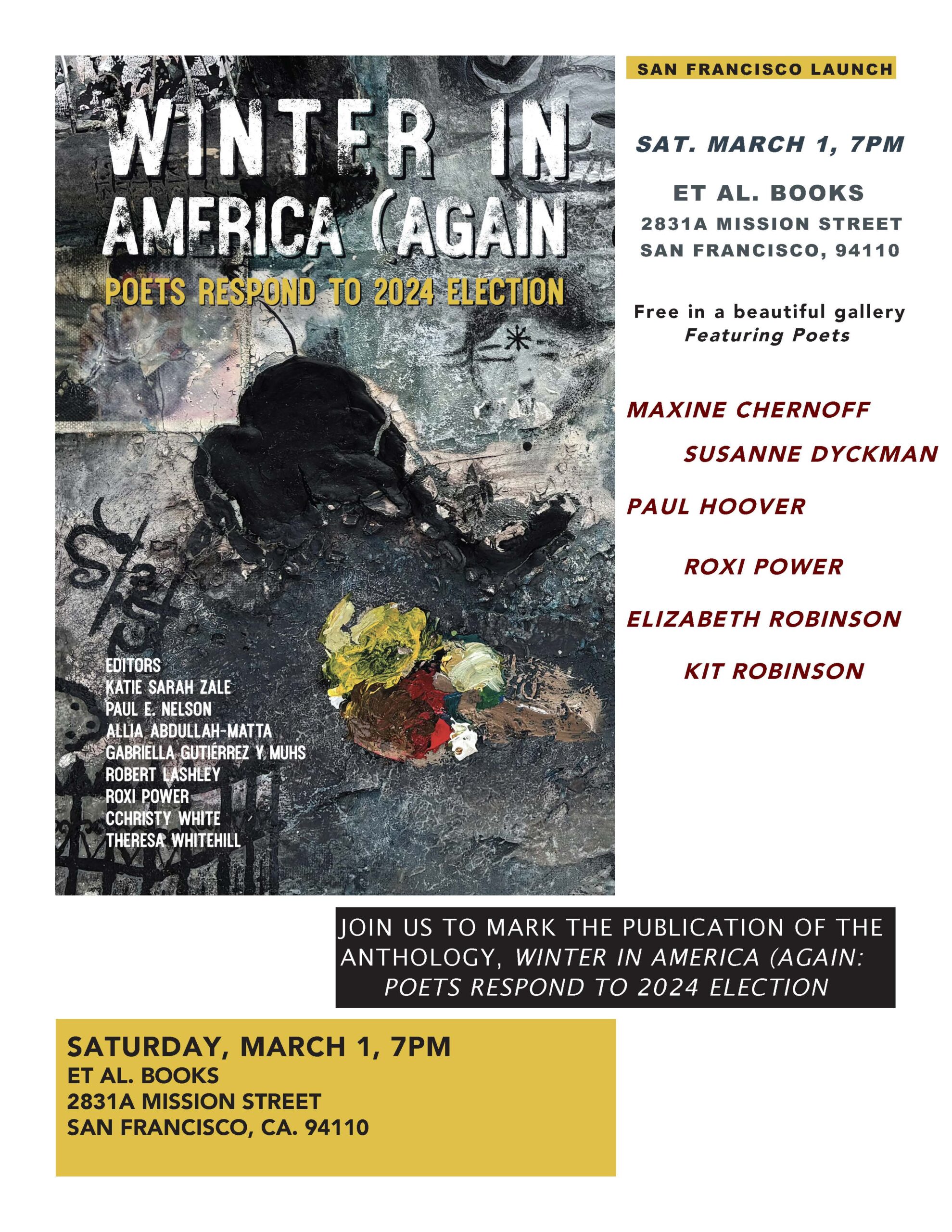 The San Francisco launch is in one week, Sat. 3/1 7pm. Free. Join at Et al.’s beautiful gallery for refreshments & a poetic refresh post-election.