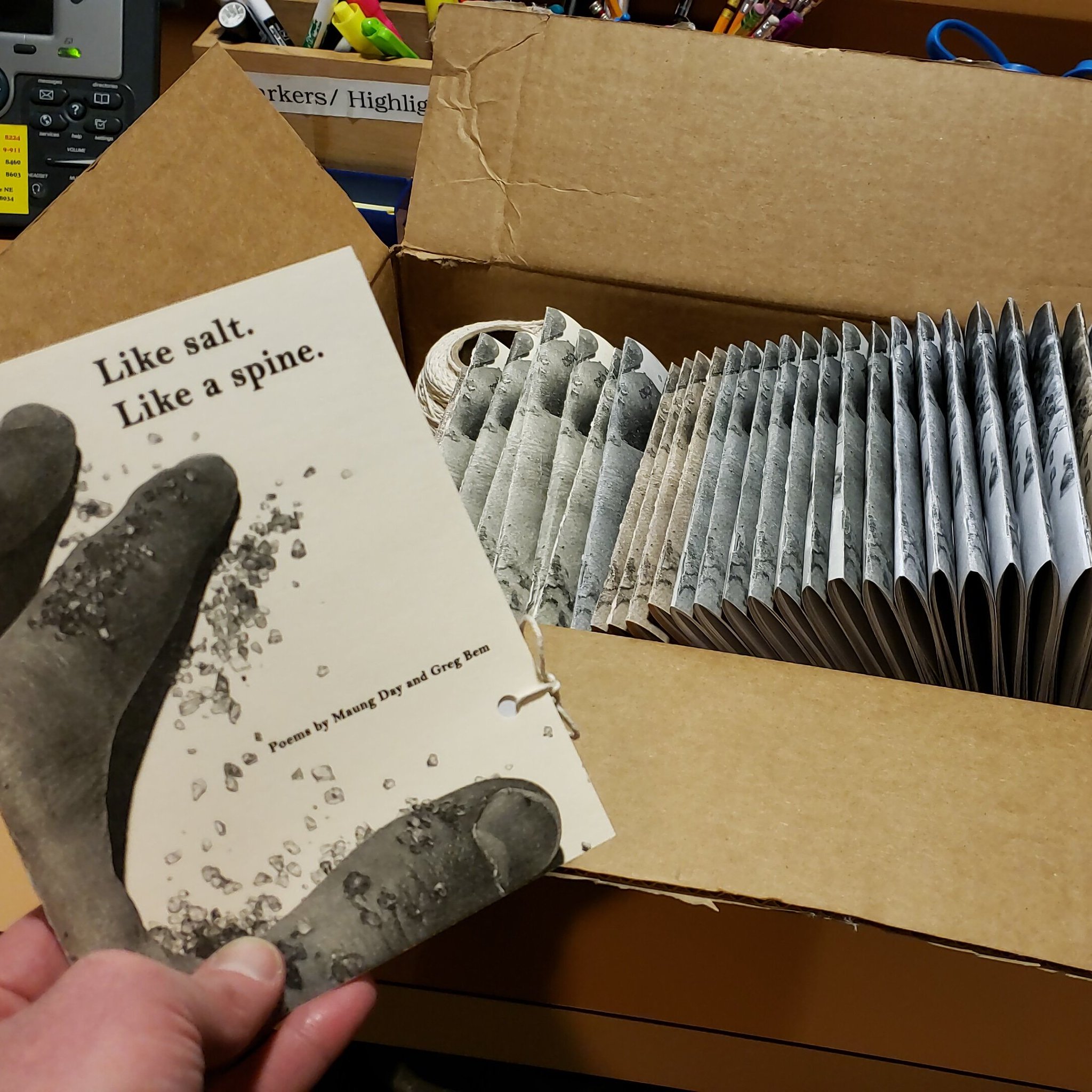 Newly released. Limited run of chapbook Like salt. Like a spine. Handmade in Seattle. Created for release in Yangon, Myanmar in March 2019. Featuring poetry by Maung Day and myself. Translated between Burmese and English. Email me if you’d like to request a copy or have comments. Digital edition may be forthcoming (still undetermined).