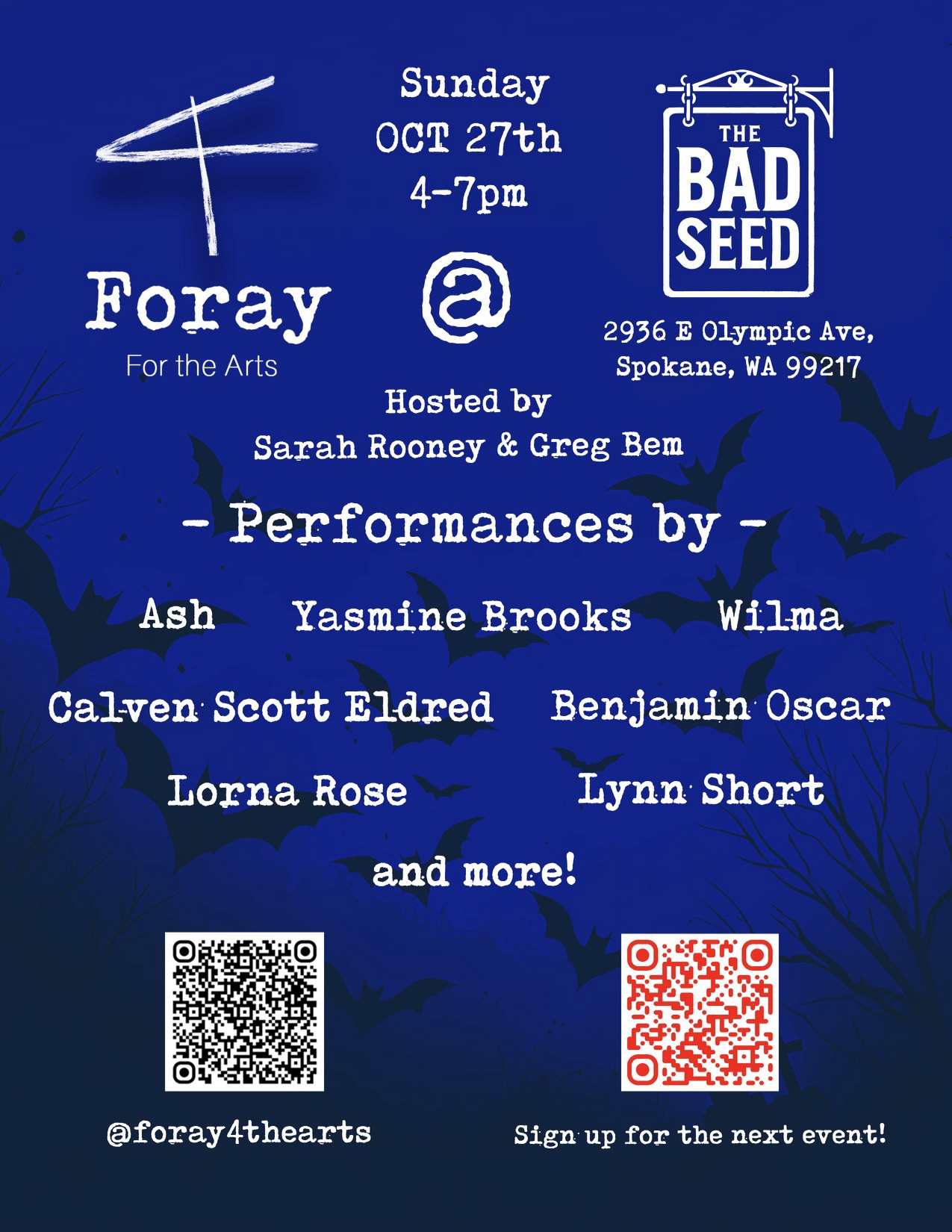 Categories Foray for The Arts Upcoming Events The next Foray in Spokane: 10/27 at The Bad Seed Post author By Greg Post date October 21, 2024 No Comments on The next Foray in Spokane: 10/27 at The Bad Seed Check out our next Foray at a haunted library-turned restaurant, The Bad Seed in Hillyard. Stay up to date via Facebook. Related ← Upcoming Seattle Reading: Cascadia Unfiltered → New Talus Field Collaboration: Unrest w/ Those Who Dwell In Dim Carcosa Leave a ReplyCancel reply This site uses Akismet to reduce spam. Learn how your comment data is processed.