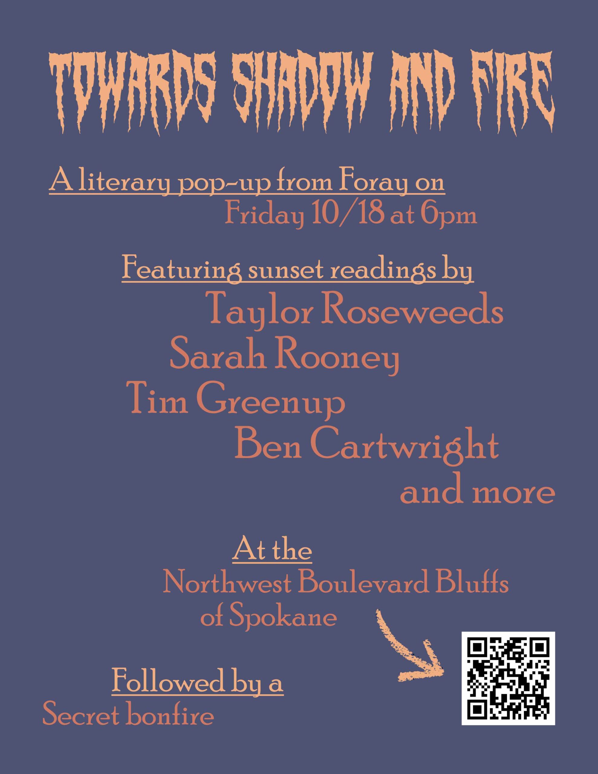 Categories Foray for The Arts Upcoming Events Upcoming Spokane Reading: Towards Shadow and Fire Post author By Greg Post date October 11, 2024 No Comments on Upcoming Spokane Reading: Towards Shadow and Fire The next Foray pop-up (or Foray Presents) event will feature Taylor Roseweeds, Ben Cartwright, Sarah Rooney, and Tim Greenup! You can find the latest about Foray on Facebook and Instagram. Related ← New Review: Communiqués by Maria Galina → Live Recording: Talus Field Leave a ReplyCancel reply This site uses Akismet to reduce spam. Learn how your comment data is processed.